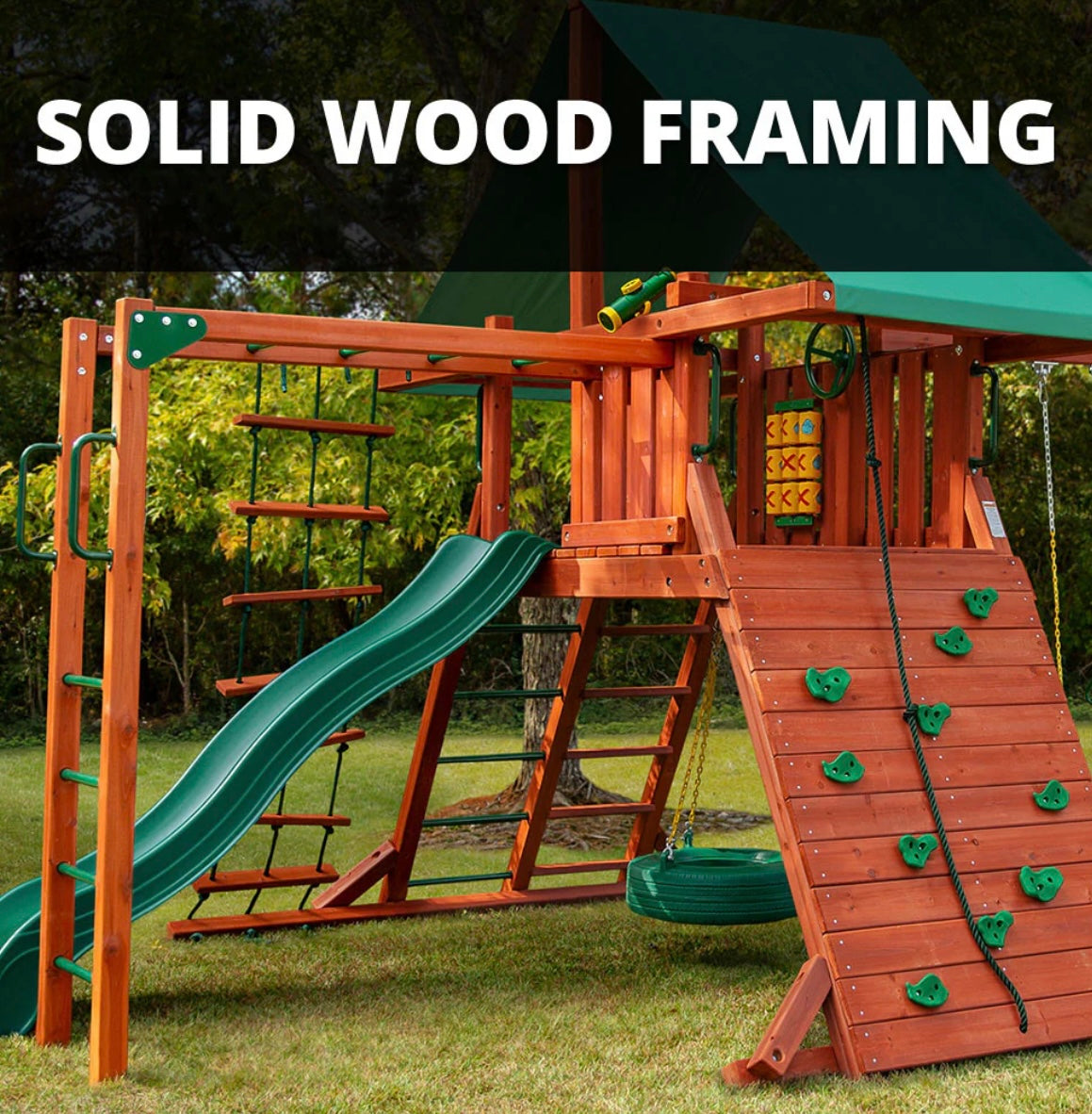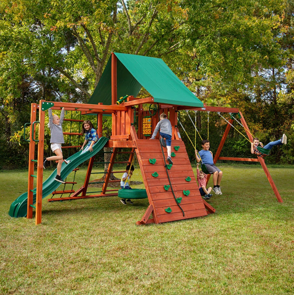 The High Point Deluxe swing set takes your backyard adventures to new heights, offering endless fun and excitement for kids. This exceptional playset goes beyond being a mere swing set. Call one of our live representatives for more information and zero obligation. (910)-520-2252